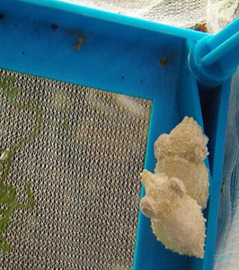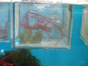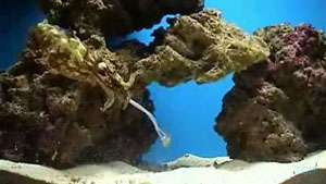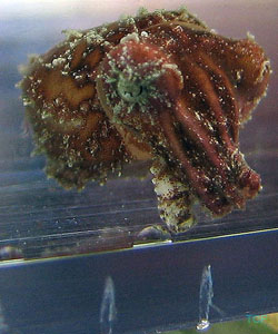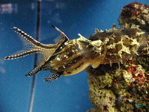 Why Cuttlesfish? I may be biased. Ok, I am completely biased. I think cuttlefish may very well be the coolest animals on the planet. They maneuver around their tank like hummingbirds, vertically, horizontally, their fin appearing blurred like bird wings. (Image 1) As they fly about they flash amazing color changes, creating patterns that pulse and shift and shimmer on the canvas of their skin. They are master predators, stalking their prey with cunning and attacking with accuracy, speed and skill. Over time, they learn to recognize and respond to you, and will often greet you when you walk into the room (or maybe they just know you bring the food). They are smart, beautiful and unusual, and unlike certain other eight-armed Cephalopods, they don’t try to escape from your aquarium. My History My infatuation with cuttlefish started when I was a kid. To me, they just looked like extraterrestrials, and they seemed so smart that I wanted to know more about them. I read about them, made expeditions to public aquariums to see them, and watched any program on cephalopods, hoping to catch a glimpse of these fascinating creatures. Through it all, I hoped for a cuttlefish of my own, but none ever seemed to reach the market. I kept seeing shows on research being done on cuttlefish, but no research station breeding them is able sell them to individuals (please don’t bother them by asking!). Twenty years later, after I had become proficient at reefkeeping, I started noticing cuttlefish appearing at local fish stores about once a year. However, they always seemed unhealthy and I was reluctant to try my hand with less-than-robust animals. Finally, in 2003 (I waited a long time!) two cuttles came into a LFS that I am friendly with. When both cuttles eagerly ate, I decided to take a chance. Two years later, I converted an entire room in my house to cuttle fish breeding and husbandry. For more information on my set up, and cuttlefish video (I am quite proud of the videos) please check out Daisy Hill Cuttle Farm. Keeping cephalopods, and especially cuttlefish, in home aquariums is still in its infancy, so I thought I would write an article with all the information I would have wanted when I started keeping them. This is not to say that there isn’t info out there – The Octopus News Magazine Online, which recently held its first cephalopod convention in Monterey Ca, and The Cephalopod Page, currently celebrating its 10 year anniversary, both have much good information and I use them often; this article is intended to supplement those resources. My hope is that one day, cultured cuttlefish will be commonplace in the aquarium hobby, and I hope that this article will entice people to not only keep them as pets, but will inspire people to breed them as well. Most of the information available on cuttlefish concerns itself with Sepia officinalis, mainly because they have been raised and used widely for research in the scientific research community. Another reason there is hobby-side information on S. officinalis is because they have been relatively easy for European hobbyists to obtain. There is sporadic importation of other species of cuttlefish into the USA, the most common of these imports is Sepia bandensis. There isn’t much information on keeping S. bandensis because they have not been studied very much in the scientific arena, and they have rarely survived for very long in the home aquarium. I believe that S. bandensis, provided captive bred/raised animals are available, are well suited to life in the home aquarium. It is important to note that I am not a cuttlefish ‘guru’ and that I expect that some of my ideas regarding cuttlefish husbandry will change as more people start keeping these animals successfully. There is much we don’t know, and it is my hope that my experience and ideas will inspire more people to work with these amazing animals, that our knowledge of their husbandry needs grows rapidly, and that captive raised S. bandensis become commonplace in the near future. Nuts and bolts Definitions: Just what the origin of the word ‘cuttlefish’ is has not been pinned down, but according to cephalopod researcher John W Forsythe, "The name Cuttlefish originally came about as the best guess of how to spell or pronounce the Dutch or perhaps Norwegian name for these beasts. It is derived from something like 'codele-fische' or 'kodle-fische'. In German today, cuttlefish and squids are called tintenfische, meaning ‘ink-fish‘. I've been told that the term fische actually refers to any creature that lives in the sea or are caught in nets when fishing, not just fishes. Anyway, that's what I understand the derivation of name to be.”1 The cuttlefish isn’t a fish at all - it is a cephalopod. Cephalopod researcher Dr. James Wood sums it up well; “Octopuses, squids, cuttlefish and the chambered nautilus belong to class Cephalopoda, which means 'head foot'. Cephalopods are a class in the phylum Mollusca which also contains bivalves (scallops, oysters, clams), gastropods (snails, slugs, nudibranchs), scaphopods (tusk shells) and polyplacophorans (chitons)”2, however unlike their relatives, cephalopods move much faster, actively hunt their food, and seem to be quite intelligent. Physiology: A cuttlefish has 8 arms, with two rows of suckers along each arm, and two feeding tentacles with at least two rows of suckers along each. The tentacles are tipped with a tentecular club, each covered with suckers while the ‘shaft’ of the tentacle is smooth. The tentacles and tentecular club act much the same as a chameleon’s tongue; they shoot out to snare prey and bring it back to be eaten by a beak-like mouth and a wire brush like tongue called a radula.(Image 2) Cephalopods have three hearts, a ring shaped brain, blue, copper based blood, and have a lifespan between 6 months and 3 years. Cuttlefish have amazing eyesight having ‘w’ shaped pupils which, according to cephalopod specialist Mark N